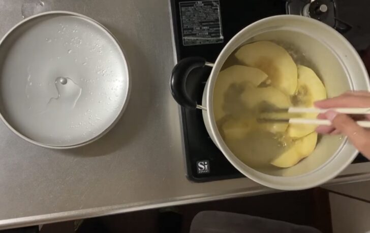 種を取り除いて、とりあえず沸騰したお湯にドボン。