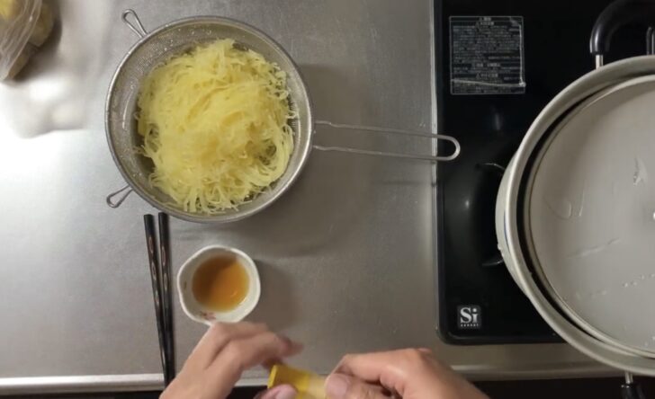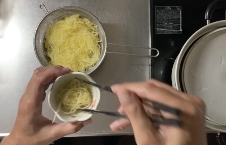 カボチャの身がスルスルとほぐれて、まるでラーメンやそうめんのような麺状になっていくんです!
